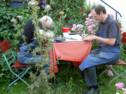 Da die meisten der ausgestellten Arbeiten in der Issinger Druckwerkstatt entstanden sind, steht dem Besucher mit dem Galeristen auch ein erfahrener Drucker für alle Fragen zur Verfügung.
